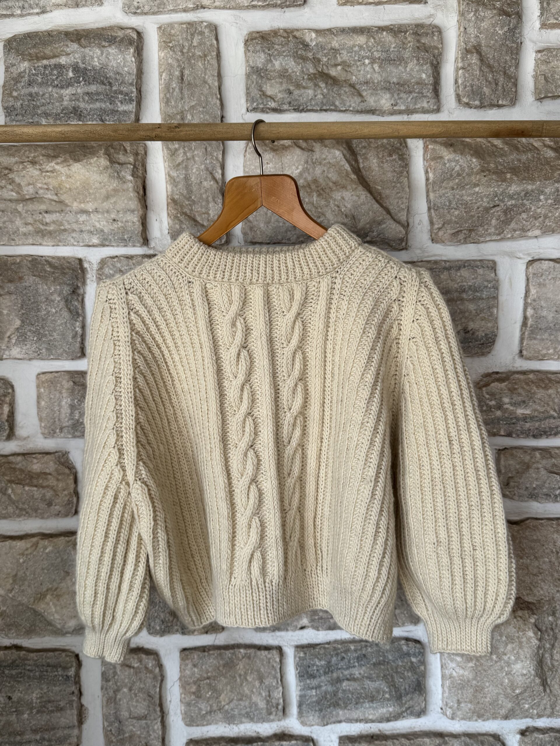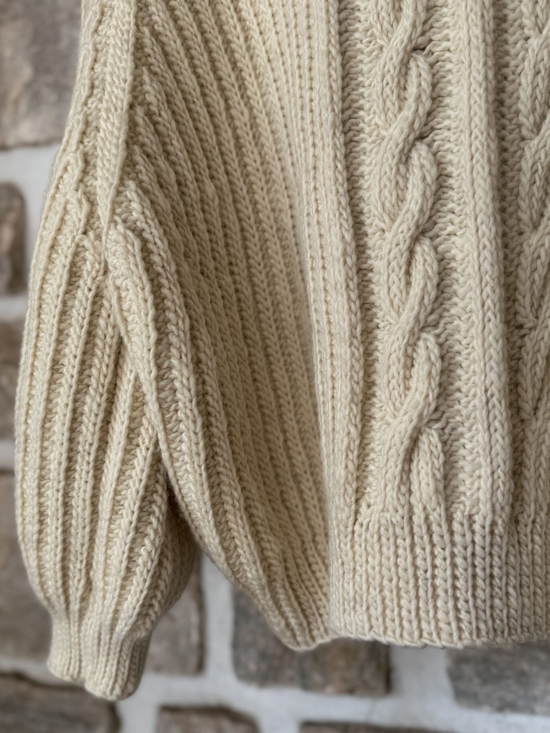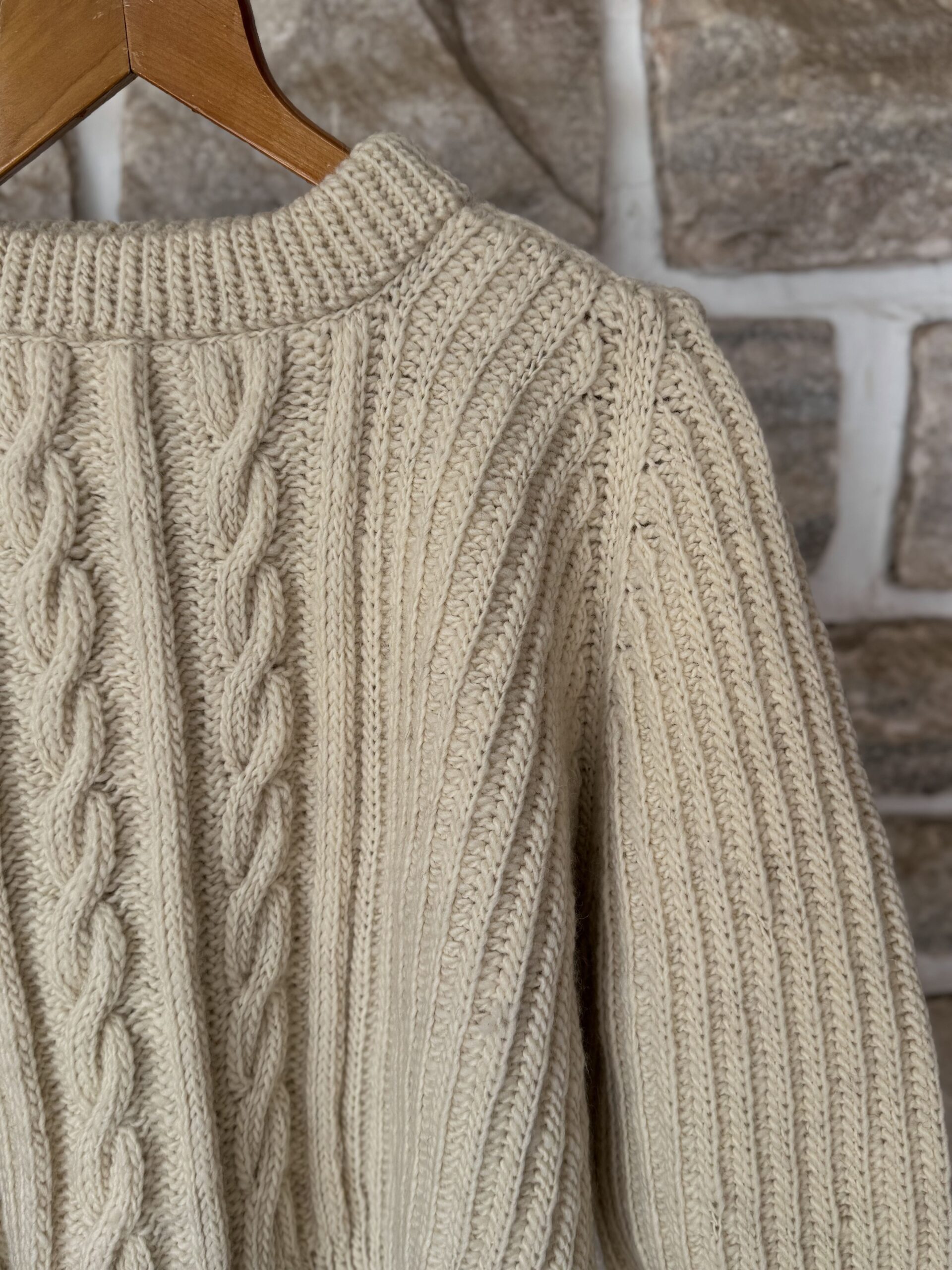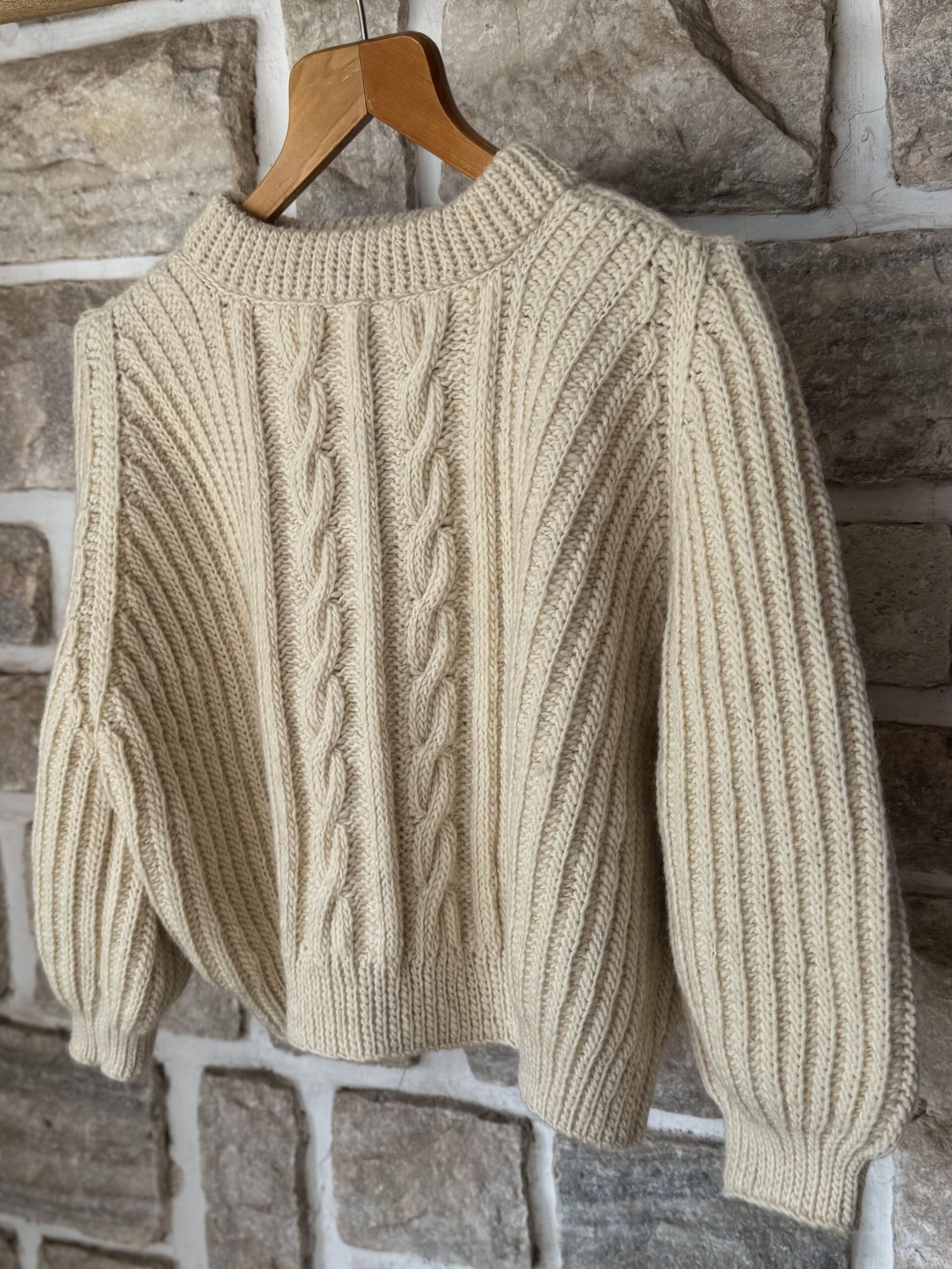 Este sweater está tejido a mano con lana de oveja 100% natural de origen cordobés. Se trata de una fibra fina de 26 micrones, trabajada de manera cuidadosa desde el lavado hasta el peinado, sin mezclas ni componentes sintéticos, lo que da como resultado una prenda muy suave al tacto, liviana y a la vez bien abrigada.
