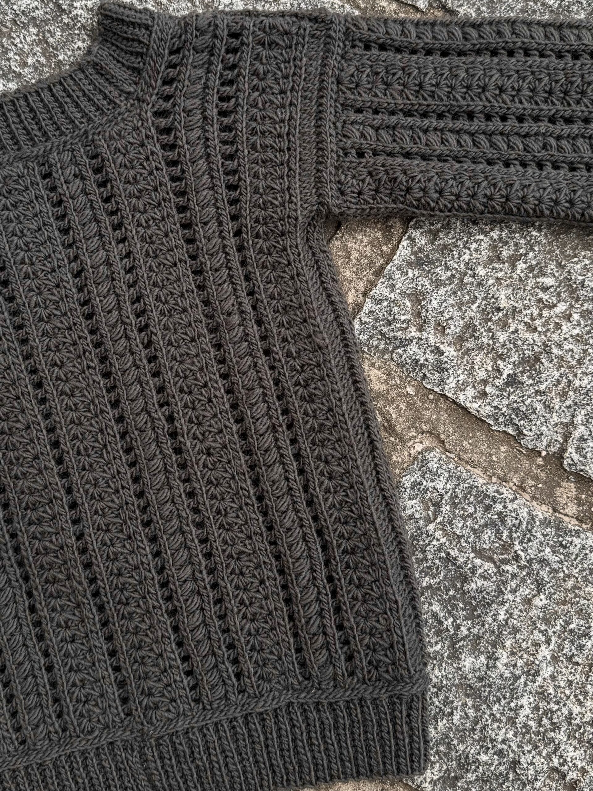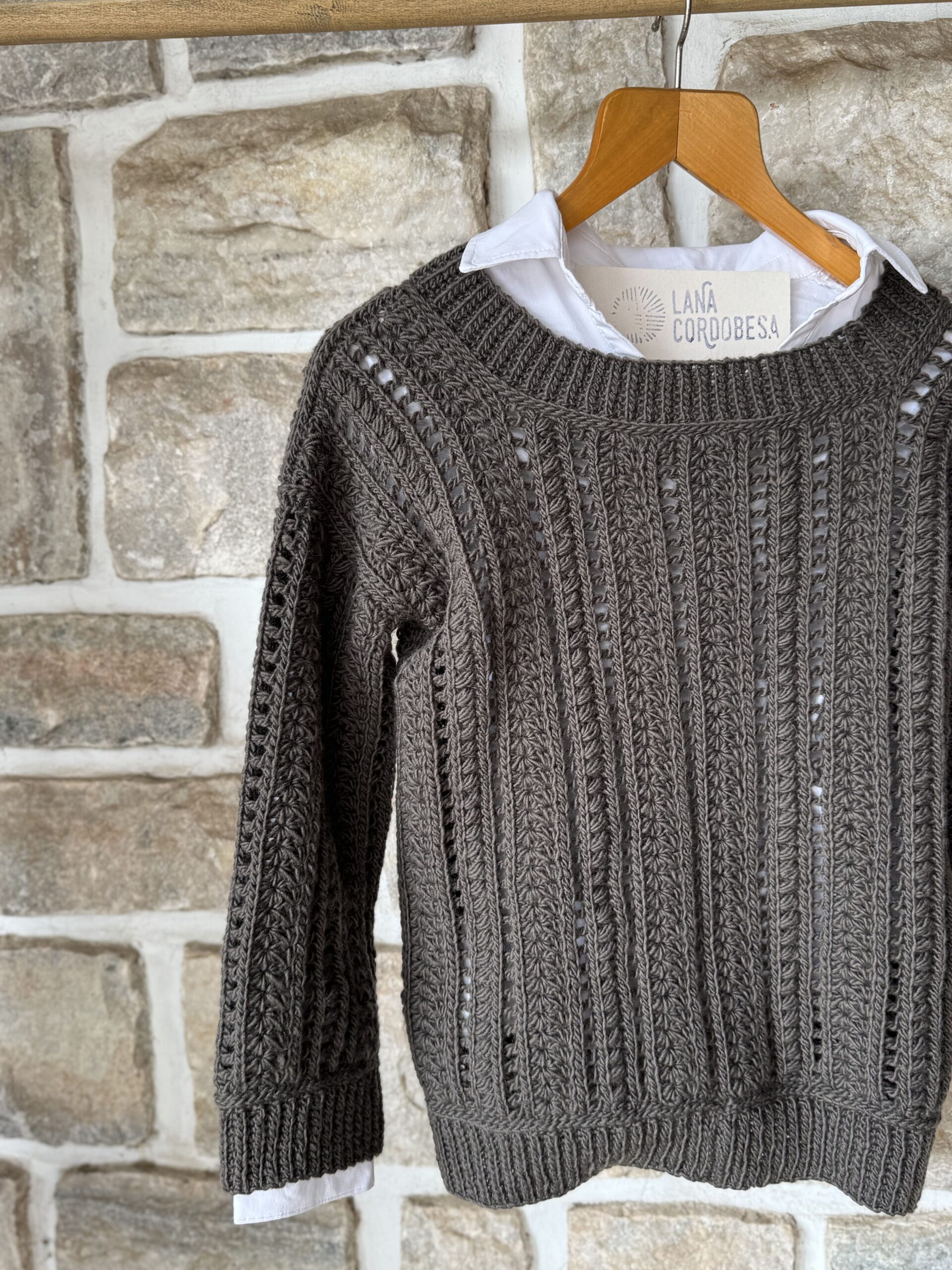 Este sweater está tejido a mano con lana de oveja 100% natural de origen cordobés. Se trata de una fibra fina de 26 micrones, trabajada de manera cuidadosa desde el lavado hasta el peinado, sin mezclas ni componentes sintéticos, lo que da como resultado una prenda muy suave al tacto, liviana y a la vez bien abrigada.